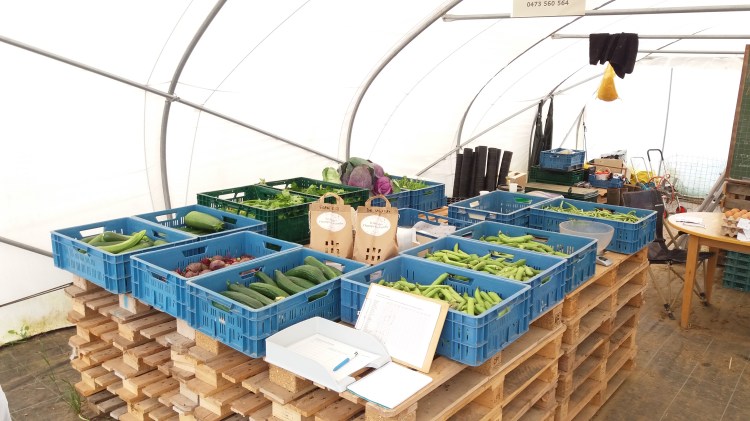 Les légumes sont cueillis deux fois par semaine (lundi et jeudi) pour étaler la récolte et en garantir la fraîcheur. Ils sont ensuite mis à disposition au champ à partir de 15h00, dans la petite serre à bâche blanche (voir sur la photo ci-dessous).